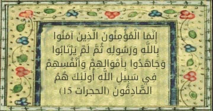 بسم الله الرحمن الرحيم (قَالَتِ الْأَعْرَابُ آمَنَّا ۖ قُل لَّمْ تُؤْمِنُوا وَلَٰكِن قُولُوا أَسْلَمْنَا وَلَمَّا يَدْخُلِ الْإِيمَانُ فِي قُلُوبِكُمْ ۖ وَإِن تُطِيعُوا اللَّهَ وَرَسُولَهُ لَا يَلِتْكُم مِّنْ أَعْمَالِكُمْ شَيْئًا إِنَّ اللَّهَ غَفُورٌ رَّحِيمٌ. إِنَّمَا الْمُؤْمِنُونَ الَّذِينَ آمَنُوا بِاللَّهِ وَرَسُولِهِ ثُمَّ لَمْ يَرْتَابُوا وَجَاهَدُوا بِأَمْوَالِهِمْ وَأَنفُسِهِمْ فِي سَبِيلِ اللَّهِ ۚ أُولَٰئِكَ هُمُ الصَّادِقُونَ. قُلْ أَتُعَلِّمُونَ اللَّهَ بِدِينِكُمْ وَاللَّهُ يَعْلَمُ مَا فِي السَّمَاوَاتِ وَمَا فِي الْأَرْضِ ۚ وَاللَّهُ بِكُلِّ شَيْءٍ عَلِيمٌ. يَمُنُّونَ عَلَيْكَ أَنْ أَسْلَمُوا ۖ قُل لَّا تَمُنُّوا عَلَيَّ إِسْلَامَكُم ۖ بَلِ اللَّهُ يَمُنُّ عَلَيْكُمْ أَنْ هَدَاكُمْ لِلْإِيمَانِ إِن كُنتُمْ صَادِقِينَ (الحجرات 14-17)