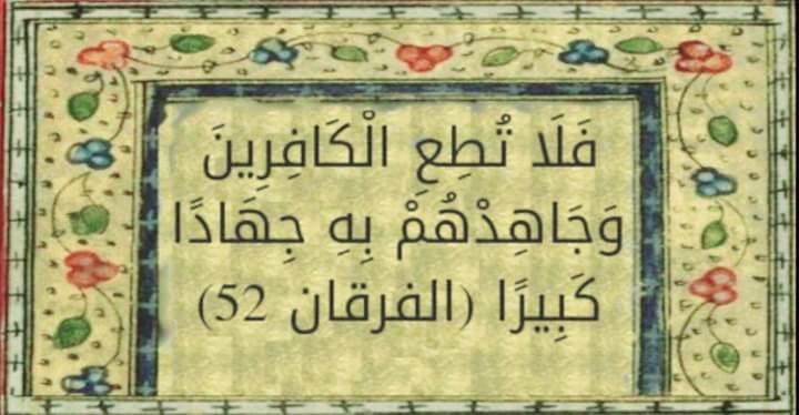 بسم الله الرحمن الرحيم (وَلَقَدْ صَرَّفْنَاهُ بَيْنَهُمْ لِيَذَّكَّرُوا فَأَبَىٰ أَكْثَرُ النَّاسِ إِلَّا كُفُورًا. وَلَوْ شِئْنَا لَبَعَثْنَا فِي كُلِّ قَرْيَةٍ نَّذِيرًا. فَلَا تُطِعِ الْكَافِرِينَ وَجَاهِدْهُم بِهِ جِهَادًا كَبِيرًا) -الفرقان الآية 52-