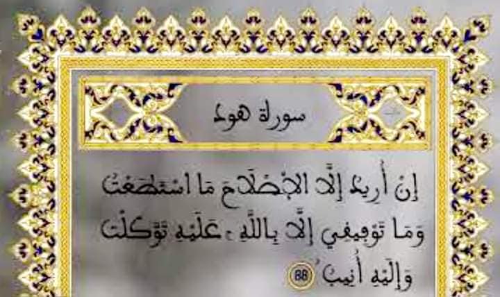 ﴿قَالَ يَا قَوْمِ أَرَأَيْتُمْ إِن كُنتُ عَلَىٰ بَيِّنَةٍ مِّن رَّبِّي وَرَزَقَنِي مِنْهُ رِزْقًا حَسَنًا ۚ وَمَا أُرِيدُ أَنْ أُخَالِفَكُمْ إِلَىٰ مَا أَنْهَاكُمْ عَنْهُ ۚ إِنْ أُرِيدُ إِلَّا الْإِصْلَاحَ مَا اسْتَطَعْتُ ۚ وَمَا تَوْفِيقِي إِلَّا بِاللَّهِ ۚ عَلَيْهِ تَوَكَّلْتُ وَإِلَيْهِ أُنِيبُ﴾ -سورة هود – الآية 88-