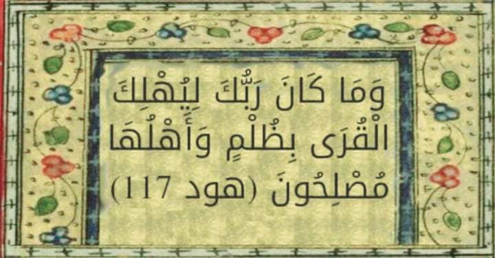 ﴿وَمَا كَانَ رَبُّكَ لِيُهْلِكَ الْقُرَىٰ بِظُلْمٍ وَأَهْلُهَا مُصْلِحُونَ﴾ -سورة هود – الآية 117-