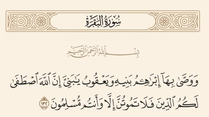 {وَوَصَّىٰ بِهَا إِبْرَاهِيمُ بَنِيهِ وَيَعْقُوبُ يَا بَنِيَّ إِنَّ اللَّهَ اصْطَفَىٰ لَكُمُ الدِّينَ فَلَا تَمُوتُنَّ إِلَّا وَأَنتُم مُّسْلِمُونَ} (البقرة 132)